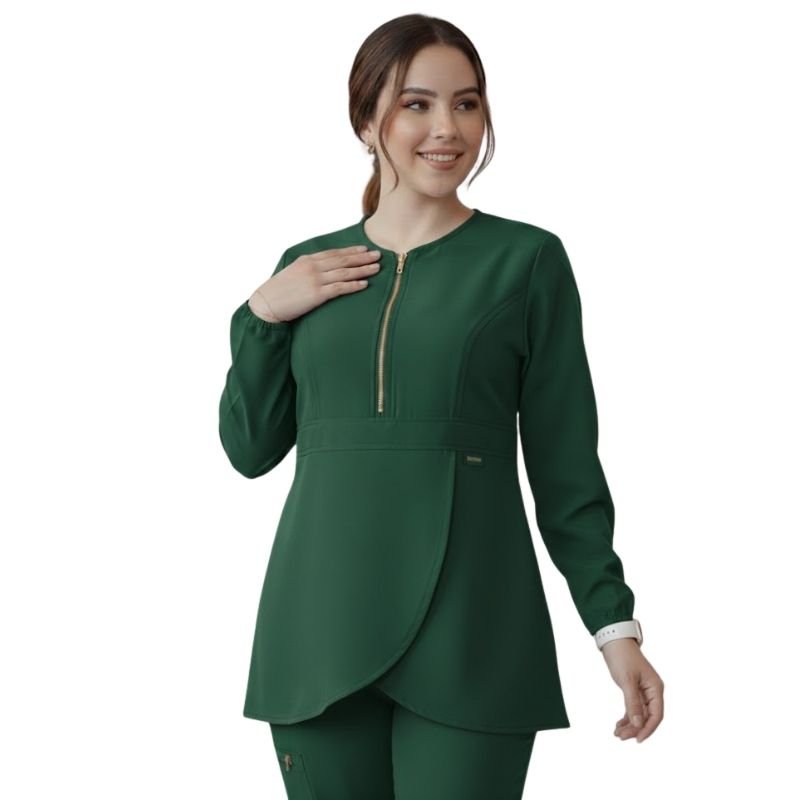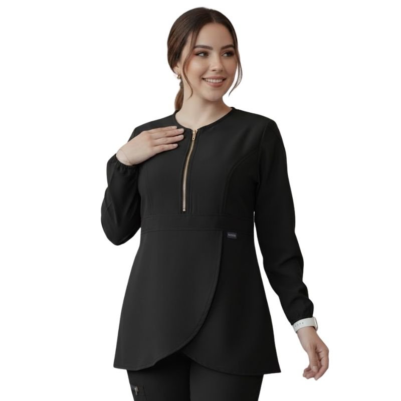 Elevate your professional wardrobe with the Aura Tunic. This isn’t just a scrub top; it’s a fusion of high-performance medical gear and contemporary fashion. Featuring a sophisticated zippered neckline, a unique wrap-around hem, and a tailored waist, it provides a flattering silhouette without compromising on the mobility you need for a demanding shift.
